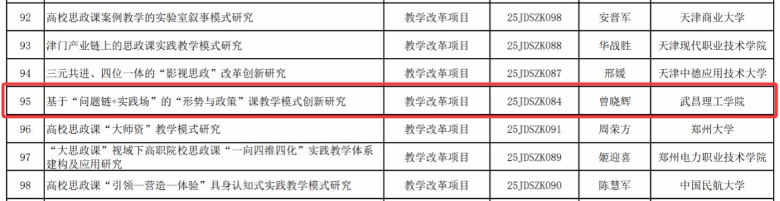 学院副院长曾晓辉主持的《基于“问题链+实践场”的“形势与政策”课教学模式创新研究》获批高校思想政治理论课教师研究专项一般项目(教学改革项目)。据悉,这是曾晓辉副院长再次获批教育部项目,其研究聚焦“形势与政策”课教学痛点,提出“问题链设计+实践场搭建”的双轮驱动模式,着力破解传统思政课单向灌输难题,增强课程的思想性、理论性与亲和力,为落实立德树人根本任务提供有效路径。